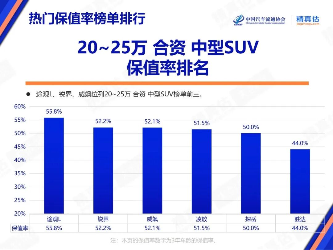 在当前20-25万价格区间的合资中型SUV市场,已成为最为激烈的“红海”领域。久经考验的经典燃油车型凭借其全面的产品力与深入人心的口碑,依然展现出强大的价值韧性。上汽大众的途观L以 55.8% 的三年保值率稳居榜首,证明了其在主流家庭用户心中不可替代的地位。