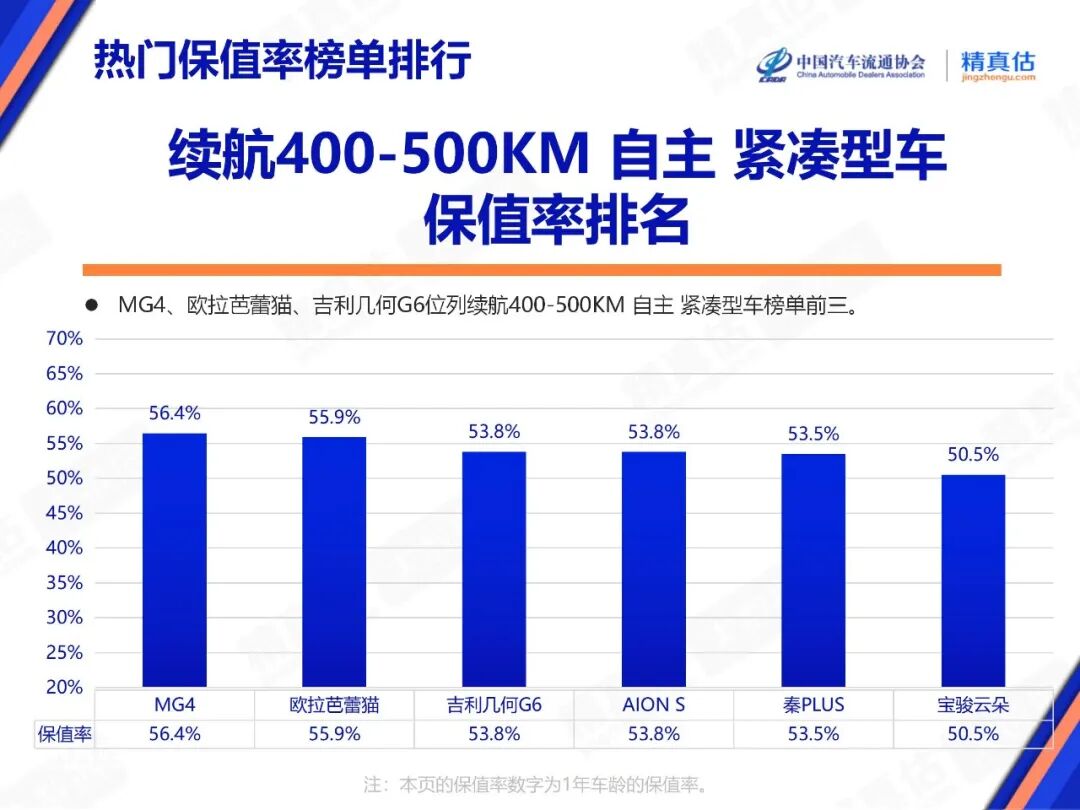在竞争激烈的纯电动紧凑型车市场中,品牌口碑与产品可靠性已成为重要的关键支撑,同时,400~500km的续航也成为该级别主流续航能力区间。名爵MG4车型不仅在三电安全、车身刚性上有扎实基础,更凭借后驱布局、五连杆独立悬架带来了在同级中突出的驾驶乐趣与操控质感,保值率位列第一,欧拉芭蕾猫、吉利几何G6位列保值率第二、第三名。